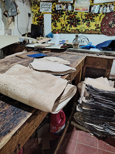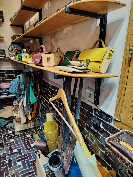 Dans un minuscule magasin, Aziz reçoit 1 à 2 personnes pour les encadrer dans la fabrication de sac ou porte-monnaie en cuir. Son instagram : Shanta.fes . Tarif : 150 Dhs / personne + produit fabriqué à régler